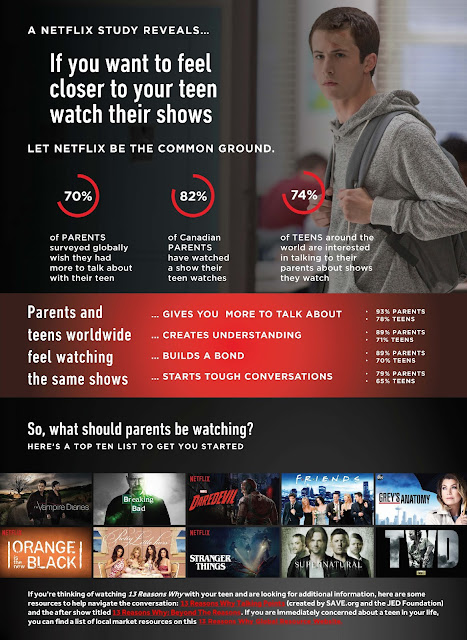 "You may not always understand your teen or tween. In fact, 70% of parents worldwide wish they had more to talk about with them. A recent Netflix study reveals a new place where you can find common ground: Entertainment. Canadian parents (82%) are already watching teen shows to feel closer to them and teens around the world (74%) are on board, saying they’d be interested in talking to parents about the shows they watch. With the majority (89%) of Canadian parents agreeing entertainment would give them something to talk about, let Netflix be the common ground and try taking a walk in your kid's shows."